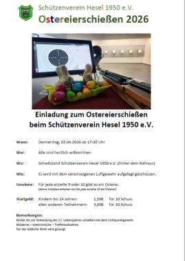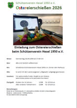 Schützenverein Hesel 1950 e.V.Hallo und herzlich wilkommen auf unserer Webseite.Wir laden Sie zu einem kleinen Rundgang durch unser Vereinsleben ein.Selbstverständlich können Sie uns gerne in unserem Vereinsheim während der Trainingszeiten besuchen, nicht nur wenn Sie Interesse an dem Schießsport haben, sondern auch einfach für einen Klön- / Teeabend.Sehen Sie sich auch unseren Seiten Kalender und Veranstaltungen an.Vom 9. bis zum 13.03 findet die diesjährige Schießsportwoche statt.HIER gibt es Informationen zur Schießsportwoche.EinladungAusschreibungAm 3. April findet das jährliche Ostereierschießen statt.Infos zum OstereierschießenÜber eine Kontaktaufnahme per E-Mail oder Telefon freuen wir uns sehr.Sie möchten Mitglied im Schützenverein Hesel 1950 e.V. werden? Infos zur Mitgliedschaft gibt es hier.Hinweis: es gibt noch ein Schützenverein HESEL.Sollten Sie den Schützenverein Hesel 1930 e.V. (Hesel, nahe Friedeburg) suchen, dann klicken Sie bitte hier: www.sv-hesel.de