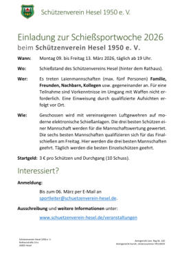 Schützenverein Hesel 1950 e.V.Hallo und herzlich wilkommen auf unserer Webseite.Wir laden Sie zu einem kleinen Rundgang durch unser Vereinsleben ein.Selbstverständlich können Sie uns gerne in unserem Vereinsheim während der Trainingszeiten besuchen, nicht nur wenn Sie Interesse an dem Schießsport haben, sondern auch einfach für einen Klön- / Teeabend.Sehen Sie sich auch unseren Seiten Kalender und Veranstaltungen an.Vom 9. bis zum 13.03 findet die diesjährige Schießsportwoche statt.HIER gibt es Informationen zur Schießsportwoche.Einladung SchießsportwocheAusschreibung SchießsportwocheAm 3. April findet das jährliche Ostereierschießen statt.Infos zum OstereierschießenÜber eine Kontaktaufnahme per E-Mail oder Telefon freuen wir uns sehr.Sie möchten Mitglied im Schützenverein Hesel 1950 e.V. werden? Infos zur Mitgliedschaft gibt es hier.Hinweis: es gibt noch ein Schützenverein HESEL.Sollten Sie den Schützenverein Hesel 1930 e.V. (Hesel, nahe Friedeburg) suchen, dann klicken Sie bitte hier: www.sv-hesel.de